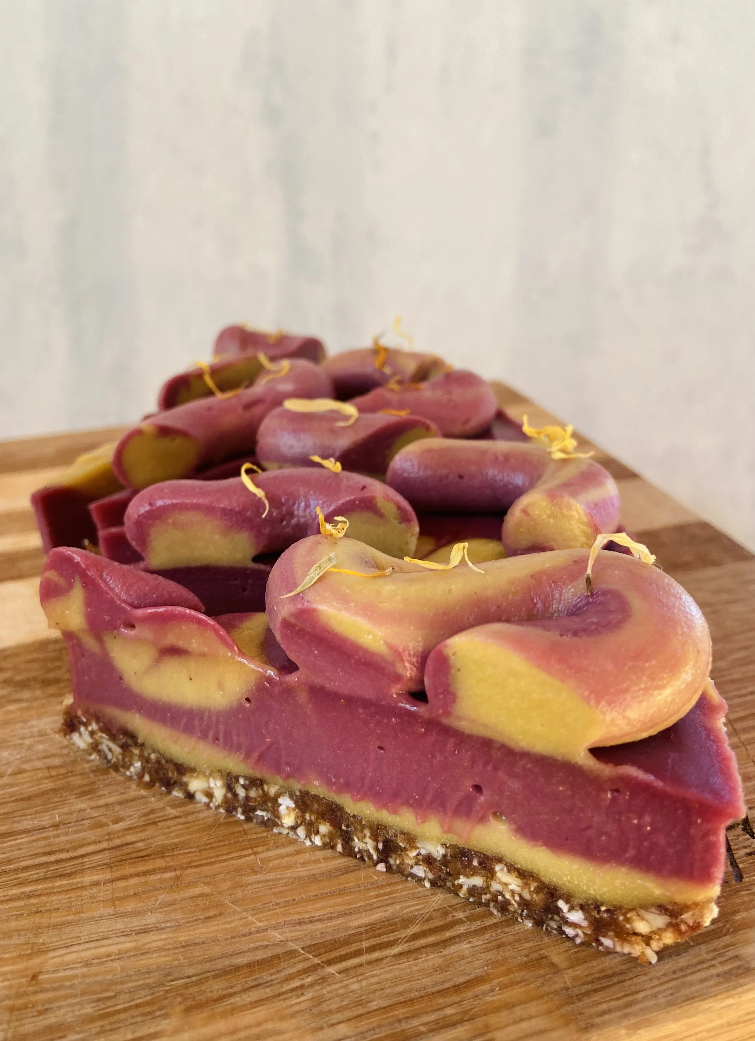 Our Berry Raw Cake has become popular for its bold and refreshing flavor, naturally colored with beetroot. The crust is made with raw chocolate.
